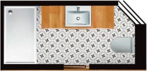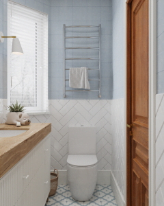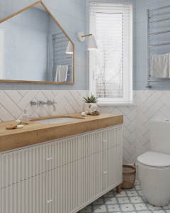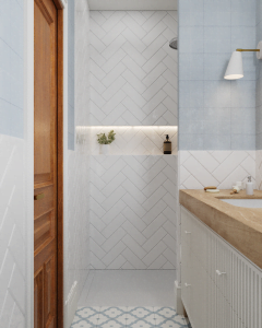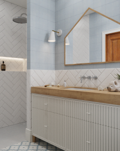 Azulejos: Se ha incorporado un azulejo con diseño en espiga, patrón geométrico en color blanco para resaltar el papel y crear un efecto de amplitud en el espacio. En el suelo una baldosa con dibujo geométrico acorde a los tonos del baño.