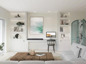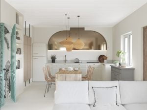 Colores Inspirados en la Playa: La paleta de colores está inspirada en la playa, como tonos arena, azules suaves y verdes. Ventilación Cruzada: Se ha diseñado el apartamento para que tenga buena ventilación cruzada. Esto es especialmente útil para aprovechar las brisas marinas y mantener un ambiente fresco y confortable.