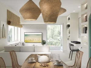 casas en la playa, sofá, aparador, mueble a medida, almacenaje, pladur, pintura, mármol, madera, techos, sillas, textil, cojines, chimenea, piedra, lana, alfombras, lámparas
